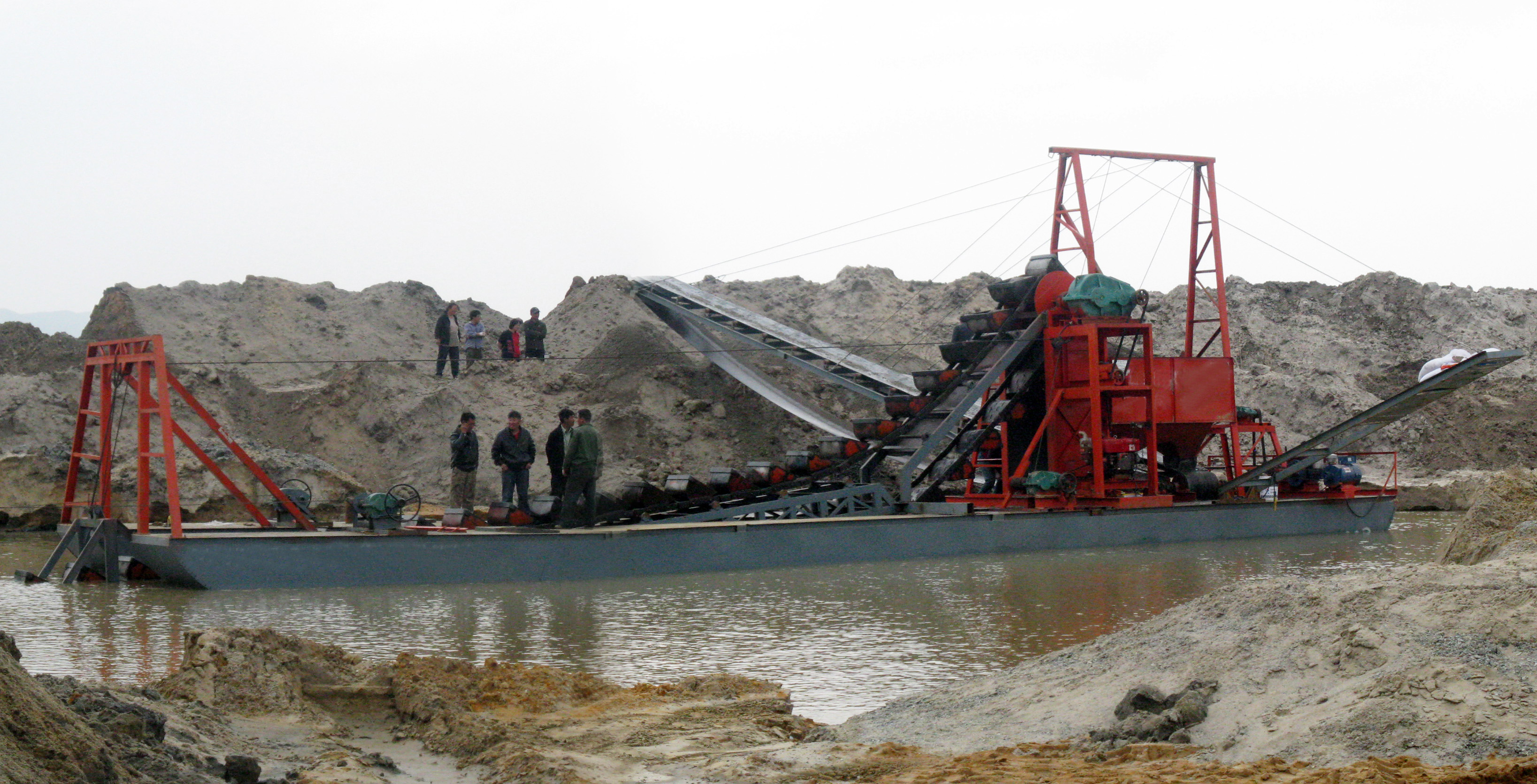 鏈斗式挖沙船是一種利用機(jī)械動(dòng)力對(duì)河床底部的泥沙進(jìn)行提取的挖沙設(shè)備,一般情況下多采用流動(dòng)作業(yè)。挖沙船的浮體采用拼裝式箱型結(jié)構(gòu),挖沙船同時(shí)還配有挖掘裝置、篩選裝置、提升裝置、傳送裝置等。挖沙船通過動(dòng)力裝置驅(qū)動(dòng)挖斗上料,石塊通過篩選傳由輸送帶傳出,沙子由輸送帶傳到指定地點(diǎn)。大型河道挖沙船的機(jī)械化和自動(dòng)化程度極高,一條挖沙船即可成為一個(gè)生產(chǎn)單位,可以實(shí)行采沙和沙石分離精選全過程。