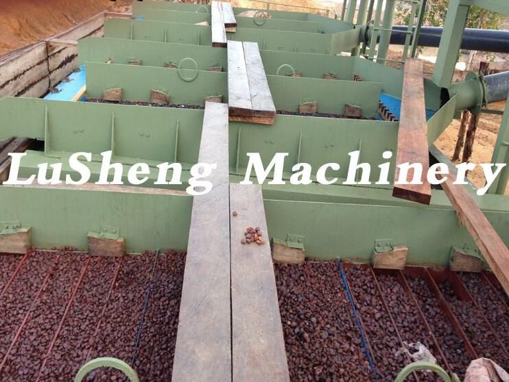 小于8mm的物料經(jīng)螺旋輸送機(jī)輸送至料倉與細(xì)碎后的物料混合。料倉下設(shè)置自動(dòng)給料裝置,將物料均勻給入往復(fù)式循環(huán)溜槽,往復(fù)式循環(huán)溜槽作為重選流程的設(shè)備,其作用就是將錫石和廢石分離,取得高純度的錫石,拋棄不含錫的廢石,達(dá)到選礦提純的目的。該設(shè)備自動(dòng)排礦精礦則直接進(jìn)入精礦池。尾礦自動(dòng)排棄。選鉭鈮礦設(shè)備