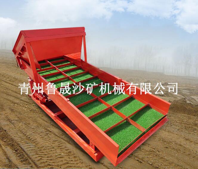 它的工作原理是上下鼓動(dòng),底部有硅膠板。硅膠板上部有隔水槽用于分流進(jìn)水和富集黃金。鼓動(dòng)溜槽通過(guò)上下鼓動(dòng)將輕重礦物分離,輕的沙子通過(guò)上下鼓動(dòng)的水流帶走排出為尾礦,精礦比重高會(huì)留在被隔水槽留住,留在隔水槽的底部。這種溜槽因?yàn)榘l(fā)明的時(shí)間早,知道此設(shè)備的人多,所以用的比較多。但是這個(gè)設(shè)備的弊端也非常的明顯,因?yàn)樗荒芑厥沾箢w粒的黃金,細(xì)顆粒的毛細(xì)金、片金、微粒金都會(huì)隨水跑掉的。