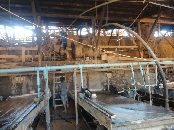 巖金礦經過破碎后就需要重選設備將黃金回收住,新型的巖金礦重選設備有:魯晟水套離心機、選礦機、跳汰機、搖床和溜槽等幾大類。溜槽類包括:蠕動溜槽、鼓動溜槽、皮帶溜槽、毛毯溜槽、振動溜槽等多種。每種溜槽所回收的金顆粒度和金的形態(tài)都是不同的。 另外往復式選礦機、跳汰機、搖床等幾種重選設備可以根據金的形態(tài)和顆粒度與溜槽等其他重選設備搭配進行金的回收。這樣才能是回收率達到高。因為每種重選機所針對的顆粒度和金的形態(tài)不同??梢圆捎寐?lián)合重選,使其達到好的效益。