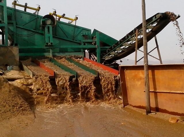 這種溜槽是采用砂泵抽到大溜上面,這種大溜沒(méi)有篩分,分離的功能,也沒(méi)有洗礦的功能,只能靠人工手持水槍沖洗,礦料從溜槽上流過(guò),通過(guò)金氈來(lái)回收黃金。還有的是采用勾機(jī)上料,把礦料上至大溜上,并且雇傭一些黑人在設(shè)備料斗上面坐著進(jìn)行手持水槍沖洗,然后通過(guò)礦料自流,通過(guò)礦料自流過(guò)金氈回收黃金。這樣的工藝流程回收率不會(huì)超過(guò)60%。
