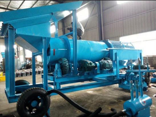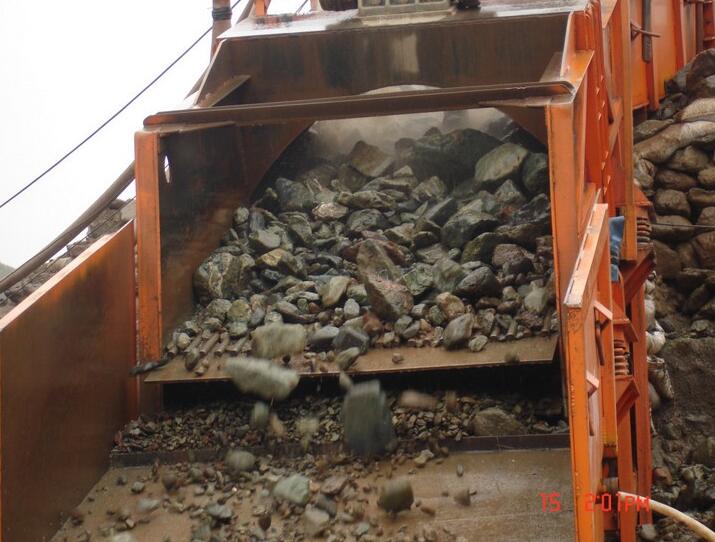 料斗不僅有全自動(dòng)洗礦的功能,礦料進(jìn)入篩分系統(tǒng)還特別的迅速,不需要給料機(jī),料斗內(nèi)部還有攪拌系統(tǒng),對(duì)礦料進(jìn)行攪拌,尤其是含泥量高的沙金礦,效果非常好。然后礦料均勻的進(jìn)入篩分系統(tǒng)。篩分系統(tǒng)是有動(dòng)力的,有滾筒篩和振動(dòng)篩兩種,滾筒篩里面帶有鉸刀,分離的時(shí)候回進(jìn)行攪拌,可以將泥巴打碎。振動(dòng)篩適用于含石頭多的沙金礦,這種振動(dòng)篩篩分迅速,效果好。